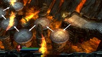 - Depuis l'escalier de départ, viser le premier pilier surplombant la lave et y planter une lance. Planter une seconde lance par-dessous, à hauteur d'homme, puis se hisser au sommet. Récupérer 1 amélioration munitions. Se diriger vers la gauche et rejoindre ensuite la plateforme supportant 1 crâne rouge (1/10).