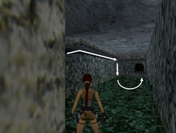 Courir le long du couloir sans s'arrêter. Au bout se laisser glisser dans la salle en dessous. Tout de suite, aller à gauche en arrière pour tomber par la dalle piège.