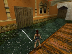 Redescendre et plonger dans l'eau. Nager vers la gauche et trouver deux recharges uzis au fond (merci à Michaël et Diaz pour cette précision). Remonter dans le bateau et aller vers le quai en face. Laisser le bateau dans l'écluse à droite. Descendre, nager et monter sur le quai. Tuer 1 rat. Briser la vitre. Tuer 1 vénitien avec un maillot blanc. Prendre une recharge pistolet automatique et une recharge fusil. Actionner le levier : la porte de l'écluse se referme et l'eau monte.