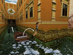 Aller à la fenêtre. La briser. Tuer 1 doberman. Aller à la fenêtre en face. Sauter sur le store rouge puis sur le balcon (où se trouve un vénitien mort). Prendre la clé du hangar à bateaux. Retourner à la fenêtre. Aller à droite dans la pièce. Suivre le couloir qui enjambe le canal et actionner l'interrupteur : une porte s'ouvre en hauteur. Revenir dans la pièce et briser la vitre. Sauter et s'agripper au store rouge en face. Sauter de store en store pour atteindre la porte. Actionner le levier : une grande porte s'ouvre en bas.