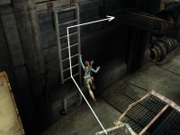 Au bout, sauter vers l'armoire électrique de l'autre côté du couloir. Contourner le coin, se laisser tomber sur le rebord et sauter vers la plate-forme juste derrière. Remarquer la barre horizontale juste au-dessus. Attendre que le courant s'éloigne pour s'y accrocher. Traverser et franchir la porte. Regarder la cinématique.