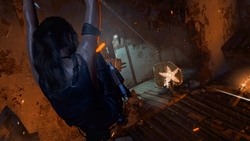Descendre via la tyrolienne et utiliser à nouveau une grenade pour briser la barrière métallique. Attention, une grosse fusillade commence. Descendre sur le petit balcon en bois mais ne pas aller plus loin. Il y a cette fois quatre vagues d'ennemis. La première vague consiste en 1 fusilier Solarii (EXP +20) au sol, 1 fusilier Solarii (EXP +20) en hauteur et 1 archer Solarii (EXP +20). La deuxième vague débarque dès que Lara touche les marches descendant du balcon : éliminer 1 artificier Solarii (EXP +20) en priorité, puis 2 fusiliers Solarii (EXP +40) dans le bâtiment d'en face. La troisième vague apparaît lorsque Lara avance vers la cabane d'en face. Attention, ils sont nombreux : 2 tireurs Solarii (EXP +40), 1 archer Solarii (EXP +20), 1 fusilier Solarii (EXP +20) et 1 garde lourd Solarii (EXP +20) avancent vers Lara, mais il y a aussi, plus loin dans les constructions, 1 fusilier Solarii (EXP +20) sur un balcon et 2 archers Solarii (EXP +40) qui lancent des cocktails Molotov. Je vous conseille donc de revenir en arrière et de remonter vers la construction métallique de départ. Lorsque les ennemis les plus proches ont été éliminés, descendre dans la rue et utiliser une grenade pour se débarrasser des ennemis éloignés. Une quatrième vague d'ennemis arrive, composée cette fois d'1 exécuteur Solarii (EXP +40) et d'1 tireur Solarii (EXP +20).