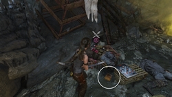 Entrer dans la caverne juste sur la gauche (ramper pour échapper au gaz) et tuer 1 fou (EXP +30). Grimper dans l'alcôve et trouver 1 géocache (1/5) (EXP +5) puis ouvrir 1 caisse (15 matériaux). Redescendre et lever les yeux pour noter 1 sac (2/6) (EXP +10) derrière les rochers.