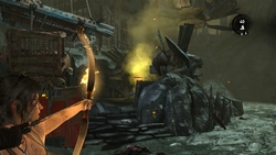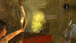Sauter ensuite vers le dessus de la cage et noter les deux sources de gaz au loin. Tirer une flèche incendiaire dans la source la plus proche puis tirer tout de suite dans le jet le plus éloigné pour libérer le second contrepoids : la cage s'élève mais Lara perd pied. Avancer vers la droite le long de la corniche puis grimper le long des échelons. Avancer vers la droite. Lorsque Lara glisse, raffermir sa prise puis contourner la cage. De l'autre côté, grimper et se hisser sur le toit de la cage. Une énorme explosion détruit la paroi de la pièce juste en face. Y faire un saut et débloquer les deux vannes de gaz. S'abriter derrière les plaches et tirer une flèche incendiaire qui touchera les deux jets : cela projette la cage de l'autre côté de la pièce et permet à Jonah, Reyes et Alex de s'échapper.