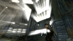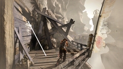 Suivre la corniche le long du mur et passer autour d'une poutre verticale. Répéter la manuvre puis sauter vers les planches horizontales. Courir et l'élancer vers la plateforme effondrée qui forme une échelle. Raffermir la prise de Lara et grimper. En haut, profiter de la vue puis entrer par la petite ouverture dans les planches sur la gauche.