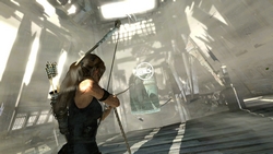 Une fois la courte cinématique passée, courir dans le couloir qui s'effondre. La course comporte trois parties. Dans la première partie, il suffit de courir tout droit et de sauter par-dessus le gouffre (plusieurs Solarii y tombent). Dans la deuxième partie, il faut faire de même en attrapant une barre horizontale pour passer le gouffre. Enfin, la troisième partie de la course est la plus retorse : il faut repérer l'endroit où le sol est instable et va s'effondrer sous les pieds de Lara, et faire un grand saut juste avant. Pour repérer l'endroit exact, chercher des planches plus sombres juste après la barre horizontale. Vous pouvez les voir en détails sur le screenshot ci-dessous.