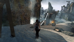 Il y a plusieurs chemins qui permettent de remonter. Le plus simple est de sauter sur la poutre métallique à l'intérieur du bateau, et de remonter jusqu'à la bâche bleue, puis se hisser en prenant appui sur la plaque verte. Remonter ensuite à l'échelle sous le mât mais s'arrêter à mi-chemin et descendre le long de la tyrolienne. Grimper ensuite sur le pilier cassé, puis sauter sur les planches blanches et se hisser sur la plateforme en bois face à la tour en béton. Éliminer les 2 archers Solarii (EXP +100) qui montent la garde.