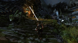 Repérer le bâtiment en feu et suivre le sentier qui le longe par la droite. En bas, observer les lampes de poche : les Solarii sont à la recherche de Lara. Conintuer à monter les marches et passer sous un portail. Regarder la courte cinématique qui s'ensuit : Lara trouve un chargeur pour pistolet. Se débarrasser de 2 archers Solarii (EXP +30). Récupérer 20 munitions pour pistolet au sol. Fouiller les corps pour récupérer des matériaux et des munitions.