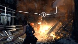 Le bâtiment prend feu ! Courir vers les planches et se hisser vers la structure. S'élancer vers la droite et s'accrocher aux poutres. Traverser vers la droite. Sauter vers la droite et s'accrocher grâce au piolet. Se hisser sur le toit (EXP +400) et observer les alentours : l'hélicoptère entendu un peu plus tôt se trouve près du pont.